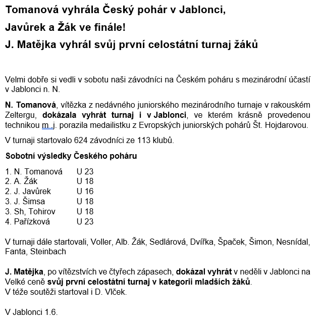Aktuality, výsledky > Fotogalerie > Soutěže > Dorost, junioři, senioři > Celostátní a krajské > Tomanová vyhrála Český pohár v Jablonci, 2025